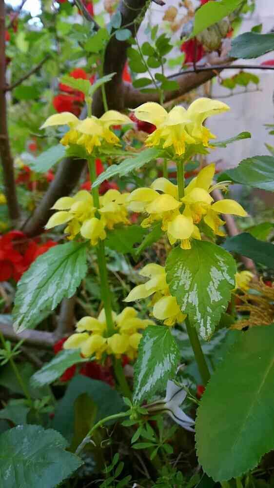 ボケの木の根元でひっそり咲くラミウムの花。さわやかなレモンイエロー💗💗