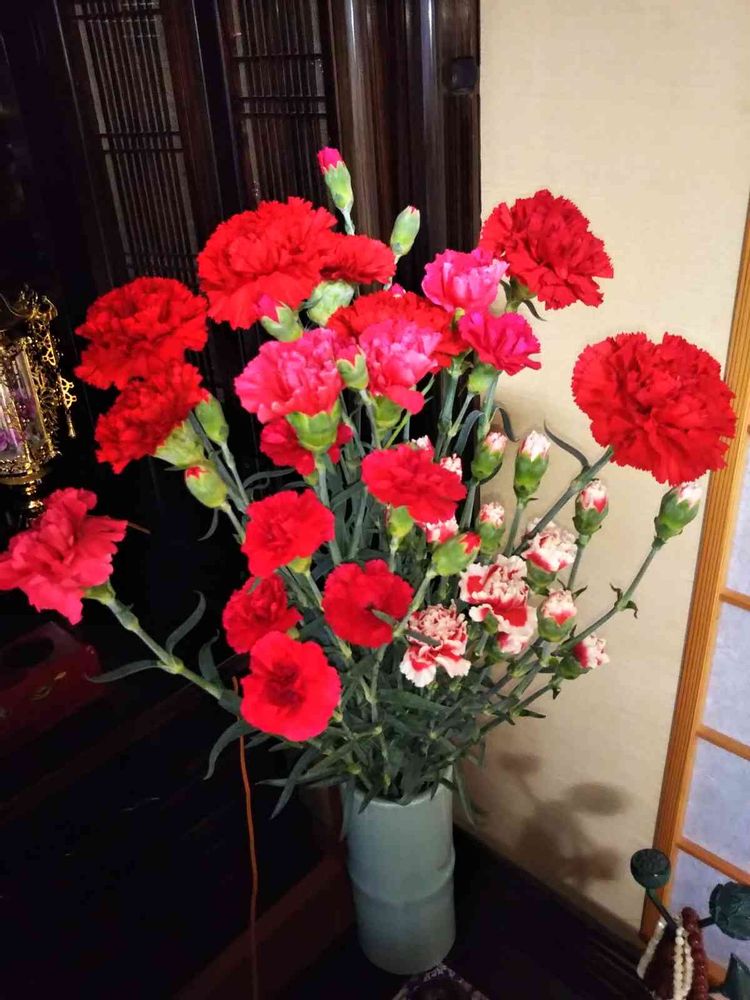 南無南無😊来月5月8日😃母の日です。4月23日囲い・園芸・男結び師匠(シンビジウム婿入り先)宅(年数回)に行きました。師匠はハウスで作業🌼水🚰やり中🌼ハウスには👀数種類のカーネーションが育ってました😃師匠からもらい、ちょい早いがお仏壇に(亡父母に)😔😔赤が満開になりました。