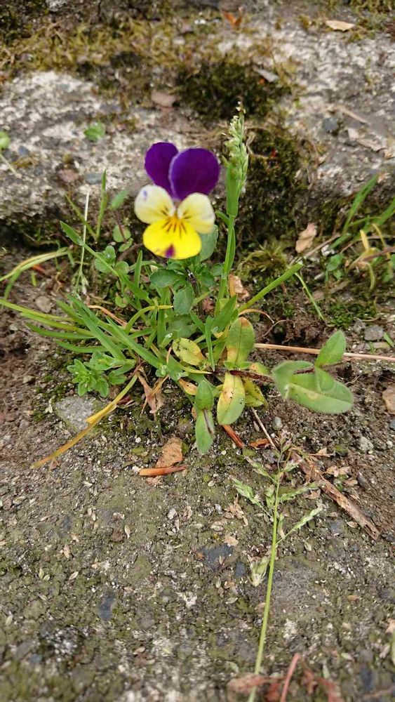 雑草に負けじとコンクリートの上でビオラが咲いてました❗