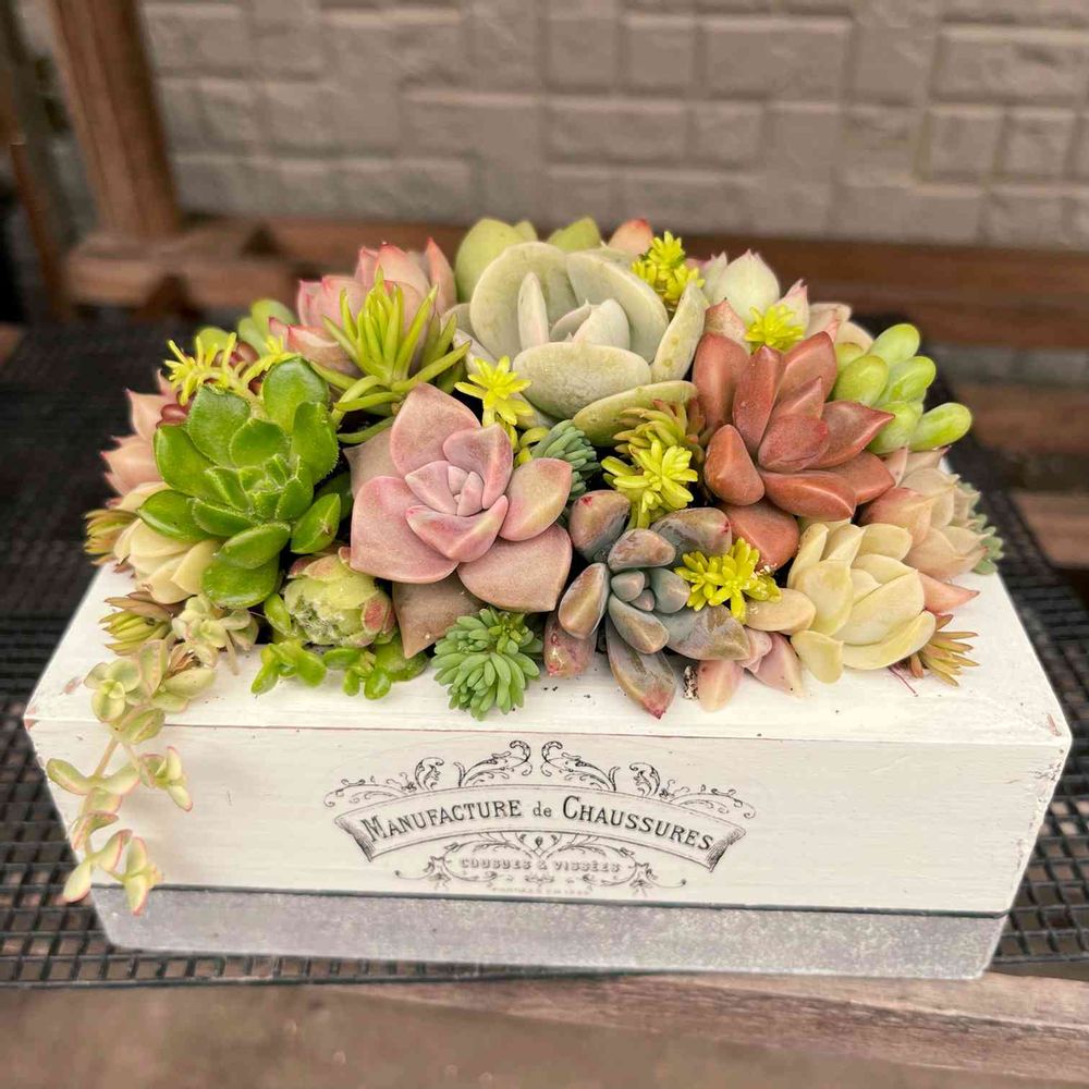 木製の鉢で、白とグレーに塗装されています。鉢底にはちゃんと穴も空いていて多肉用です