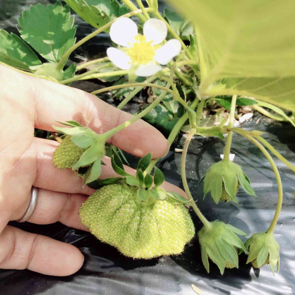 花が散り、小さな実をつけ始めたと思ったら…ひとつだけ超BIGサイズを発見!!👀🙌🍓
