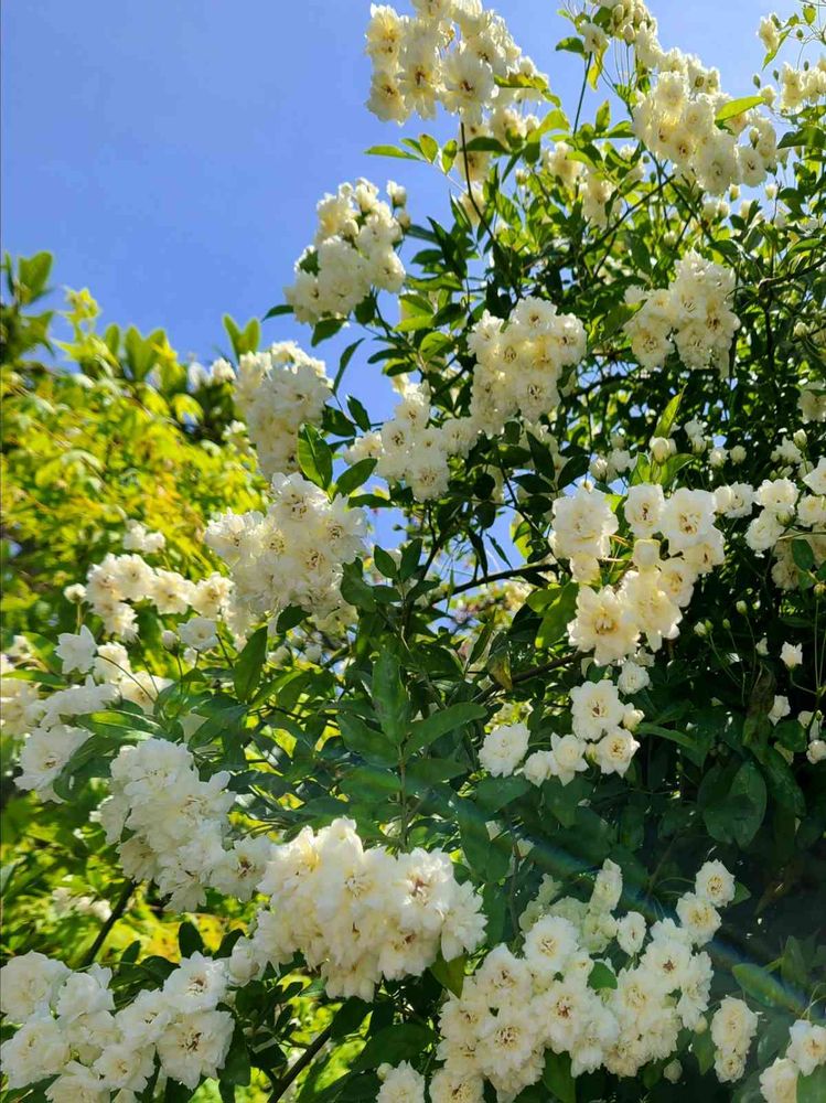 青いお空に真っ白なモッコウバラを撮りたくて首が痛くなりましたがとても⤴️⤴️良い雰囲気に撮れたかなぁ☺️