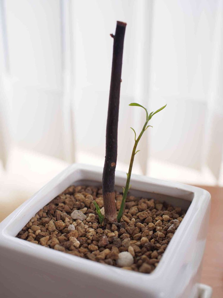 葉を落としても生きてるようだったので、気長に見守ってると、ついに新しい茎が伸びてきました✨