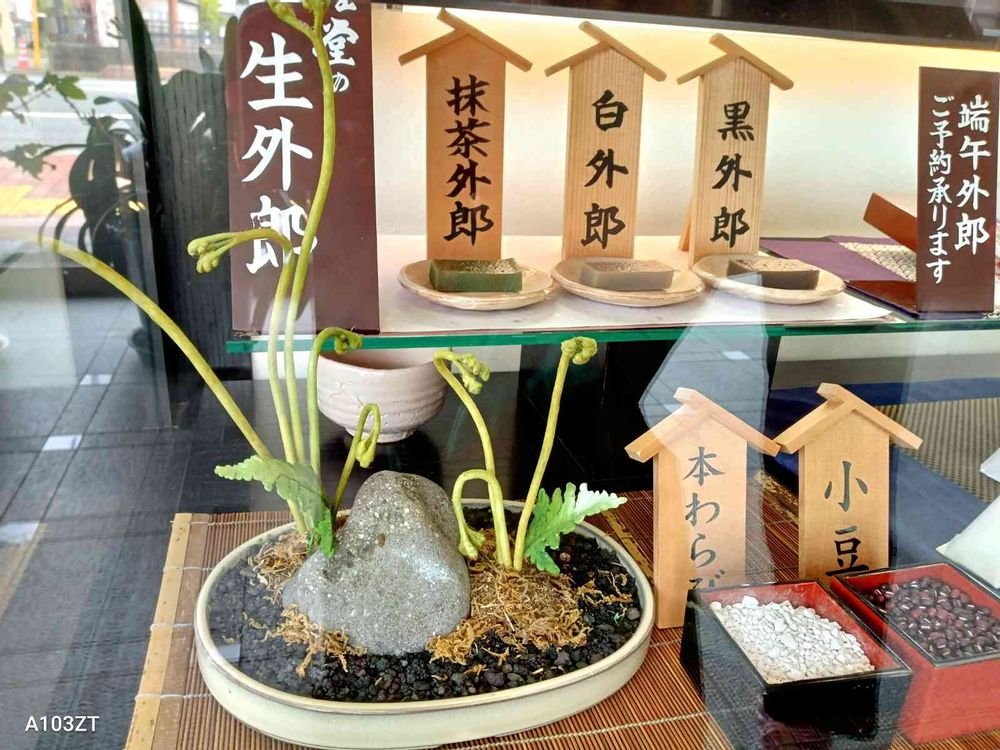 外郎に蕨が使われているので、蕨の造り物がショウウインドウに、有りました。