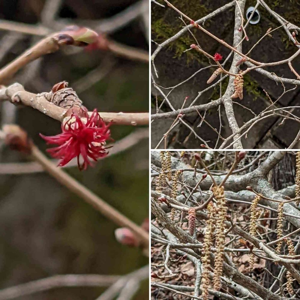 ツノハシバミの雌雄異花の雄花、雌花、特に雌花は赤いイソギンチャクみたいですネ!