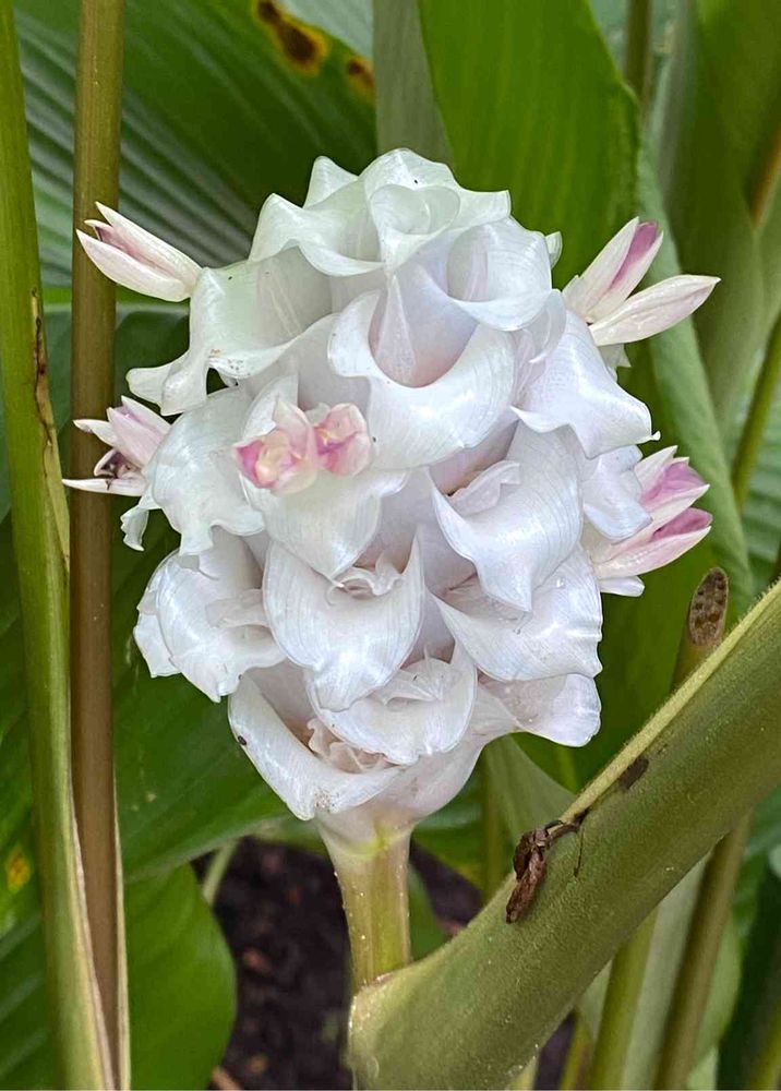 青白く蝋細工の様に光る花びらかと思ったら、これは苞と言うもので苞から飛び出してる部分が花になるそうです😃