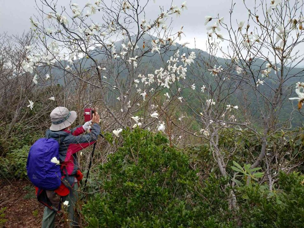 タムシバを撮っている私の後ろ姿を友だちが送ってくれました。雨が降りそうだったのでリュックにカバーかけています。腰にカッパ脱いで巻いたり