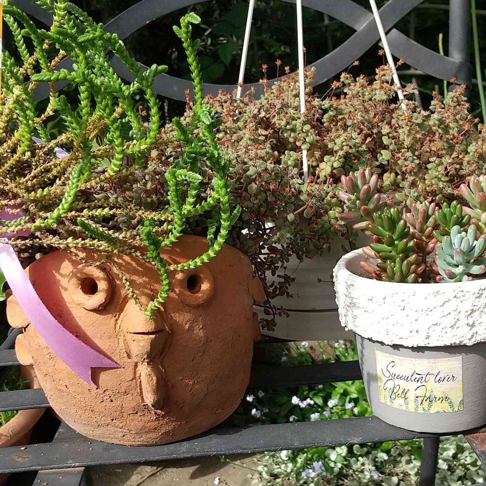 グラン・マさんから頂いたハニワ風?の鉢にモリモリ溢れてきたブロウメアナと若緑を植えました。