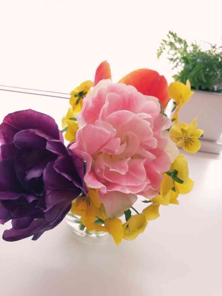 強風で花首が折れてしまったチューリップたちと、切り戻したビオラ🌼