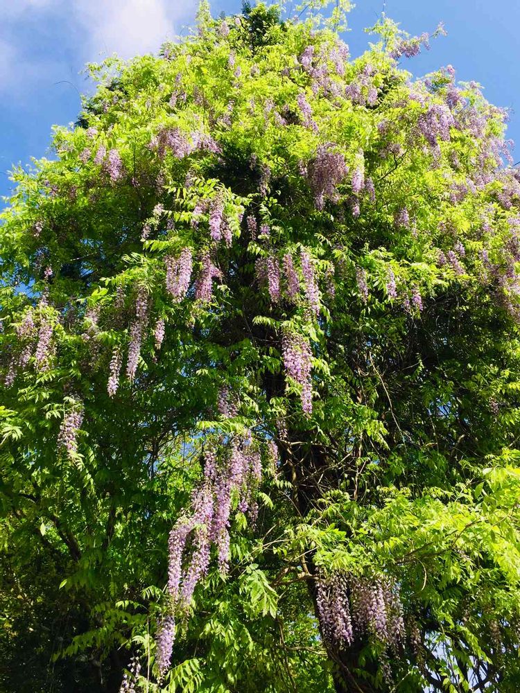 山影にあり、遠くからは見えづらく去年まで気付きませんでしたが、木の上の方でフジが揺れているのに気付き、導かれるように山の中へ入ってみると フジをまとったこの木がそびえ立っていました。一昨日の大雨で根元にはたくさん花びらが落ちていたので、もっと咲いていたんでしょう。早くに見つけられなくて、ごめんよー。