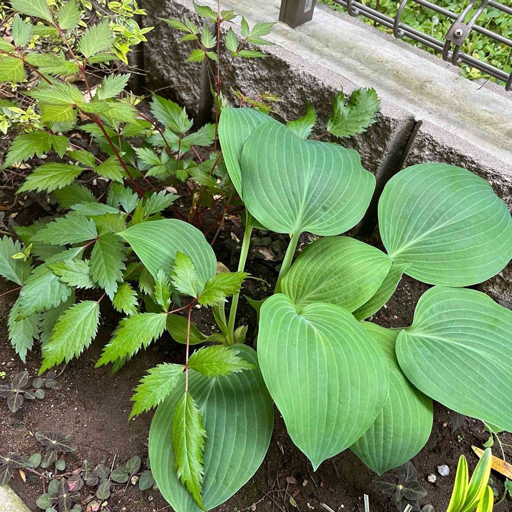 日陰のスペース。確か晩秋にアスチルベを植えてみたんですが、春になり急成長してきて、しかもお隣のギボウシも出てきたから場所争いになってしまいました💦