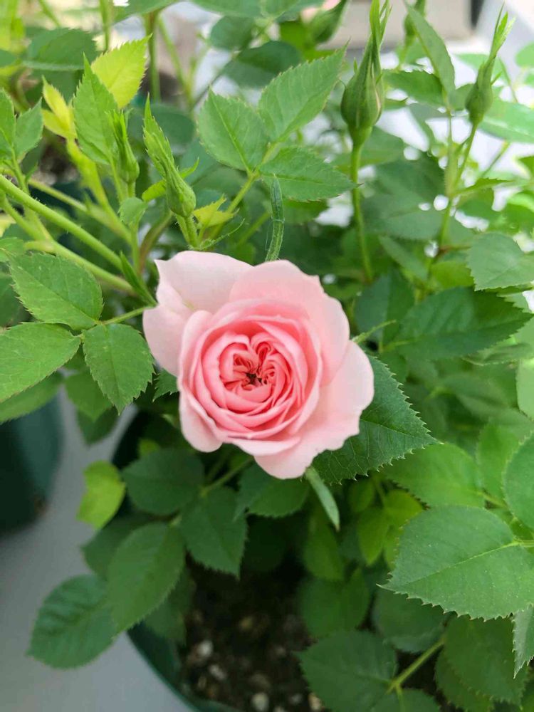 おととしの誕生日に主人からプレゼントしてもらったミニバラ、ピーチ姫です。冬に植え替えをして、たくさん蕾がついています🥰第一号が開花しそうです!