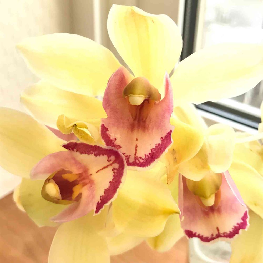 今朝出勤したら休憩室の窓辺にいたシンビジウムちゃん。