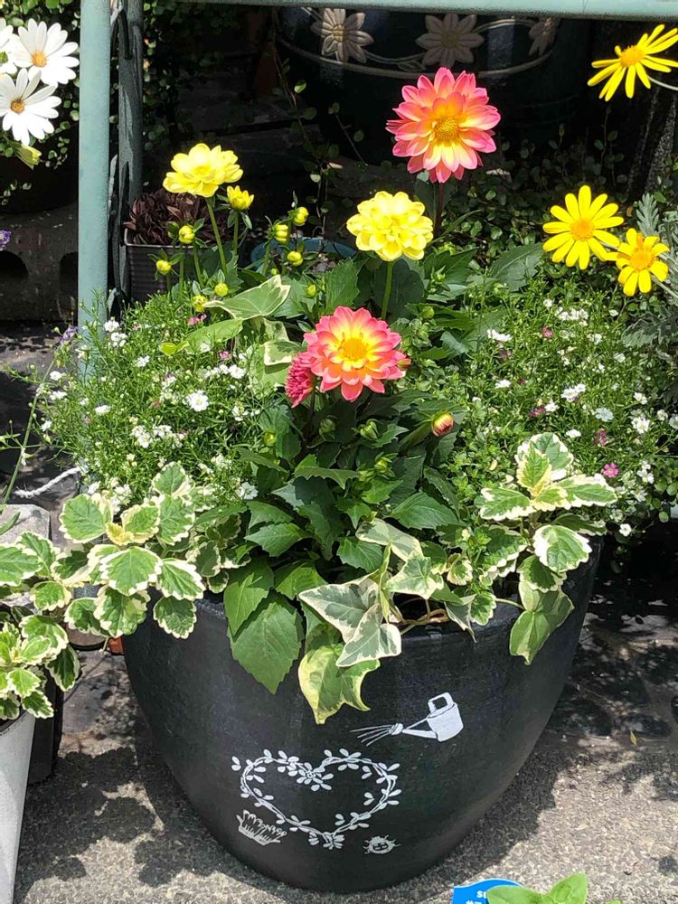 かすみ草やリーフが入って優しい雰囲気の寄せ植えですね😊 ダリアの花色もめっちゃ可愛いです😆
