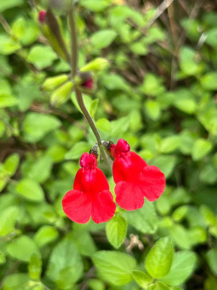 グリーンに浮び上がるように、真っ赤なチェリーセイジ