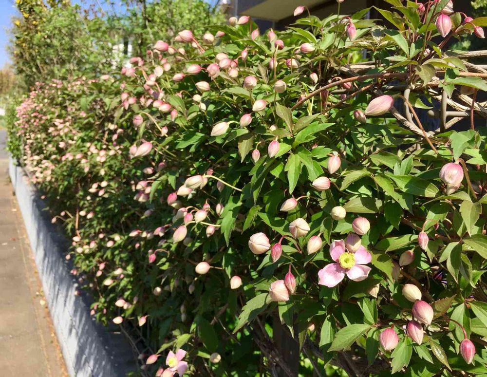 クレマチスのモンタナ系をフェンスに絡ませているのですが、蕾がたくさんついているので、満開になるのが楽しみです(o^^o)♡