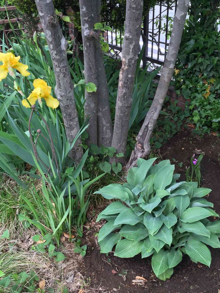 ブルー系の葉が美しいギボウシはヤマボウシの根元に。夏の強い日差しが避けられるといいのだけど…。