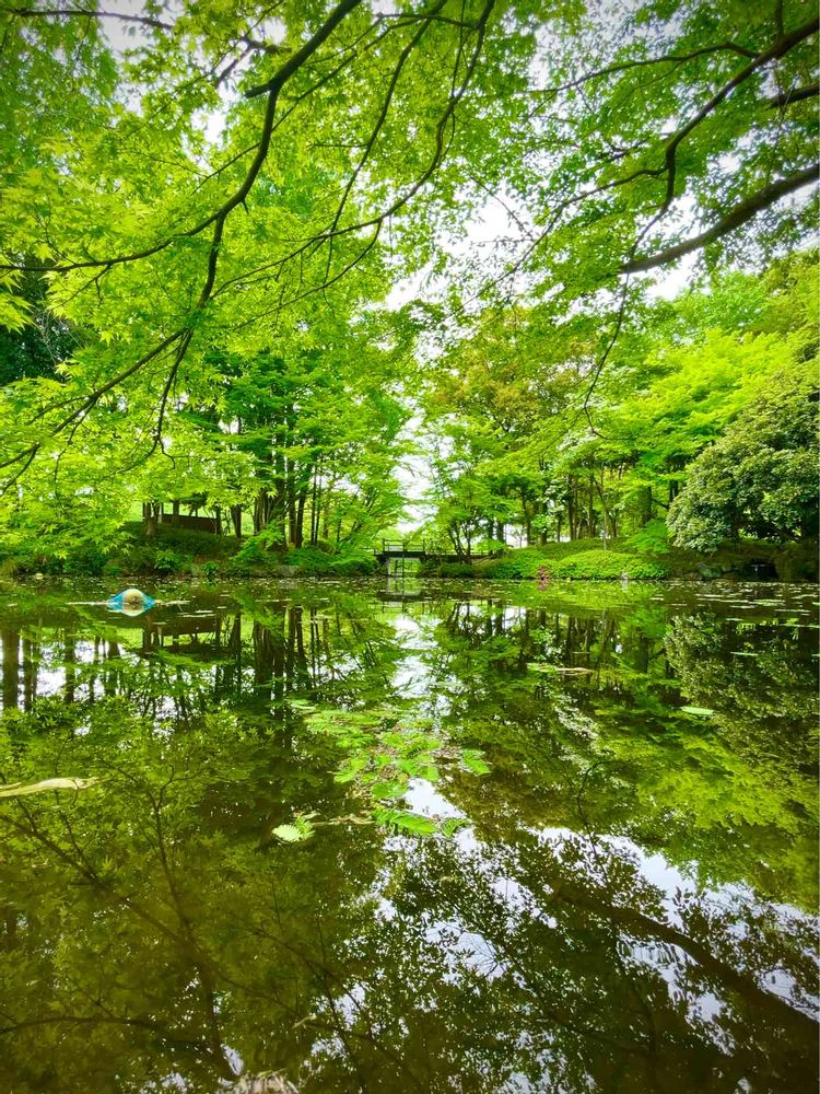 新緑の木々と水面に映り込んだ木々の色合いが違うからかもですかね😊