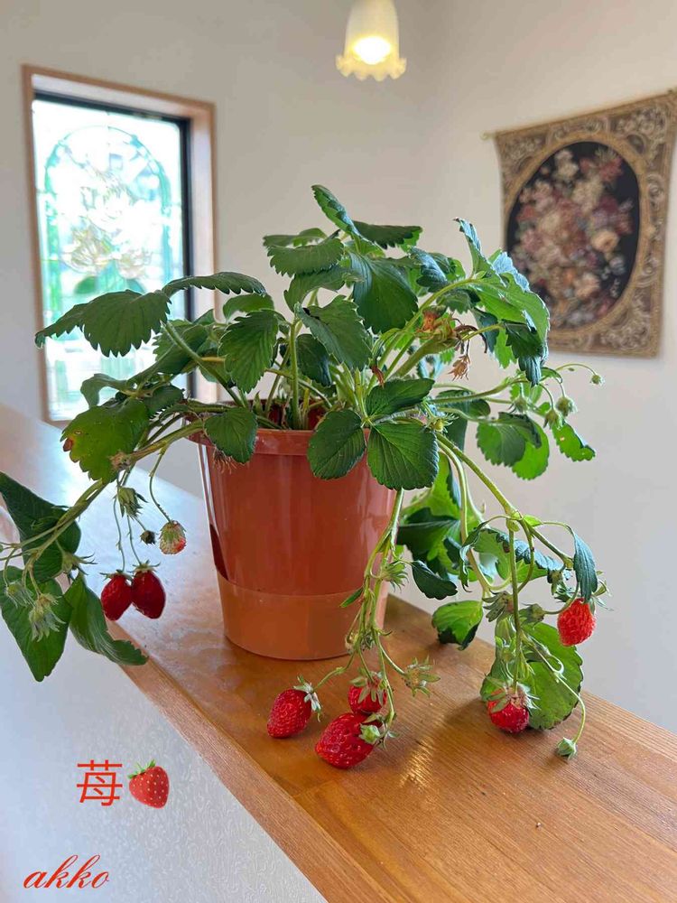 雨で部屋の中に避難していた鉢植えの苺🍓沢山実って