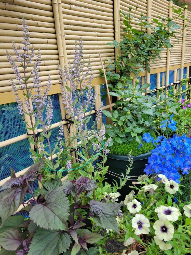 手前はネペタとユーパトリウム、冬越ししたペチュニア💠と植え替えしたデルフィニウム💙
