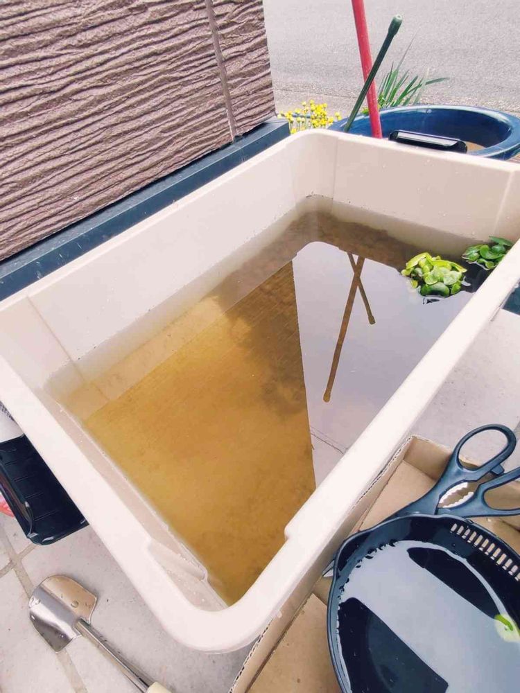 プラ舟をコーナンで800円で購入してきました!70匹程を濁りがとれたら、いれてみます。外は外敵多くて、早速、ボウフラ?みたいなのがいて、駆除。