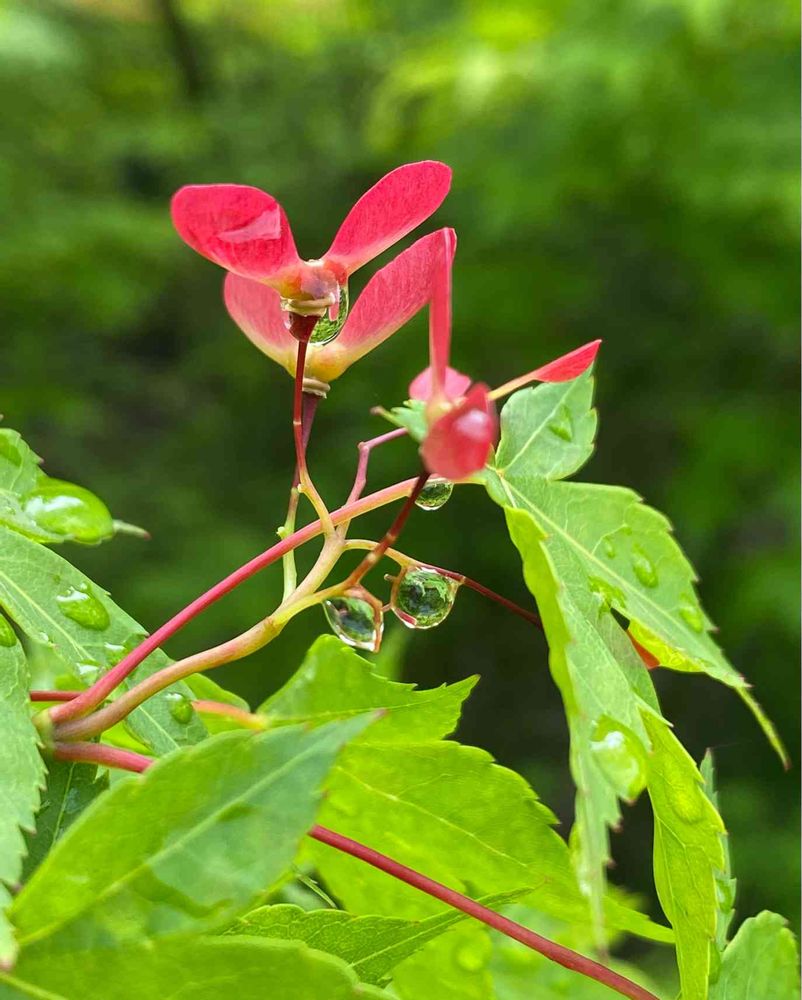 雨上がりの散歩道で、新緑が美しい青紅葉と鮮やかな赤の翼果に出会いました😄