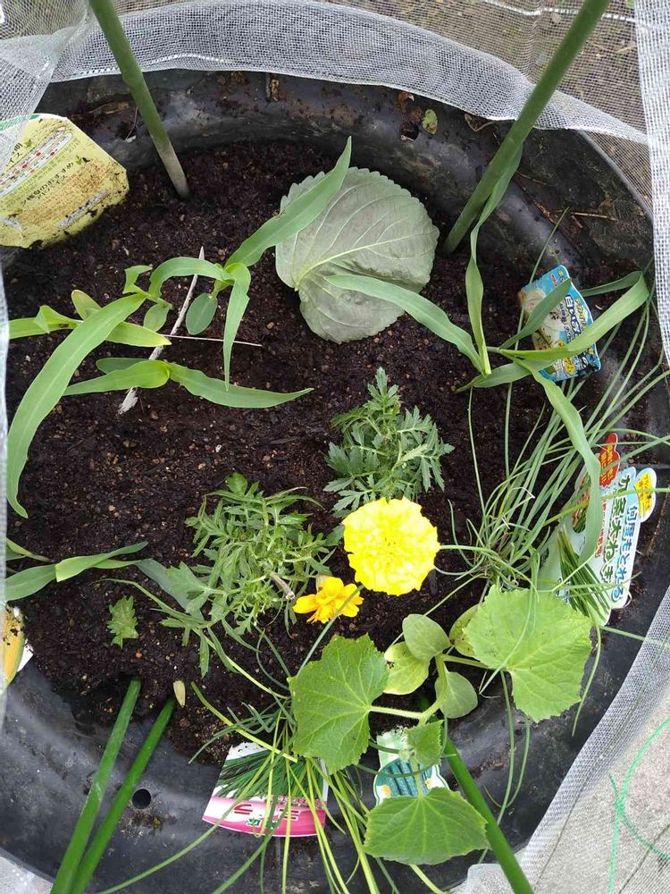 緑のカーテンがてら胡瓜にネギとニラとトウモロコシとマリーゴールドを寄植えにしました。