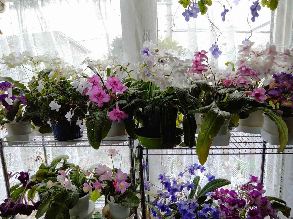 出窓が狭いのでラックがギリギリで、せめて曇った日はカーテン開けてと思うけれど、葉を引っ掛けてしまったり花を折ったりするので難しいのです。😩