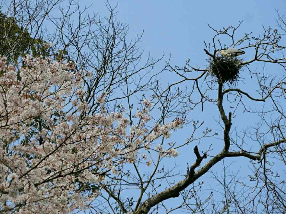 大木の桜🌸を見上げてホッコリしようと思ったのに、隣の落葉樹に目立ちまくりの巣がぽこぽこ付いてるから、お花見どころではなくなった…親鳥を待ってみるとよく田んぼで見かけるサギさんでした🐦