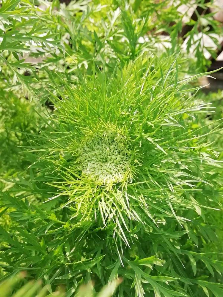 どうしても庭に咲かせたくて、人参は1本秋に食べましたが、後は食べずに残してあります💕 すくすくと育って、中心にはこんな塊ができました😀