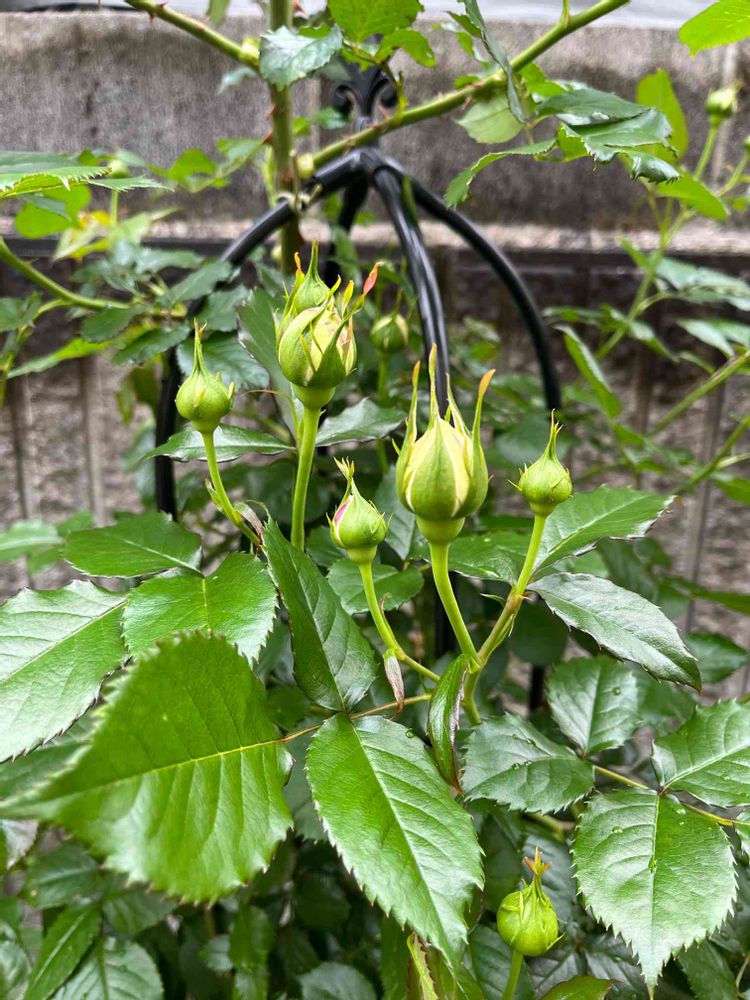 ピエールドゥロンサールオベリスク仕立て🌹たくさん蕾が付いてます。一斉に咲いた姿を想像して毎日ワクワクが止まりません🤣🤣🤣