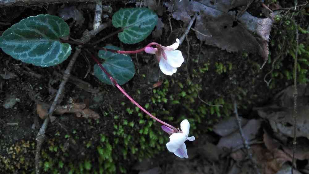 タチツボスミレはあちこちで咲いていましたが、このスミレは薄暗いところに白い花なので、一際目立ち、また、その特徴のある葉の模様に強く惹かれました😍✨