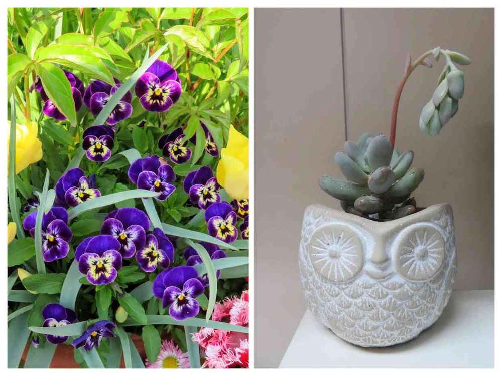 フクロウ祭に参加します😃🦉去年の9月に種まきしたビオラ・ふくろうももか、シャクヤクの足元で元気に咲いています😁右は、前出の星美人、フクロウの鉢に入れてみました💚😍🦉