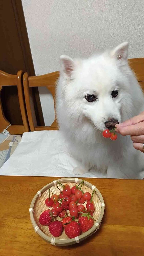 綺麗なワンコと美味しそうな苺🍓とさくらんぼ🍒😊やっぱり実のなる植物は良いですね〜😋