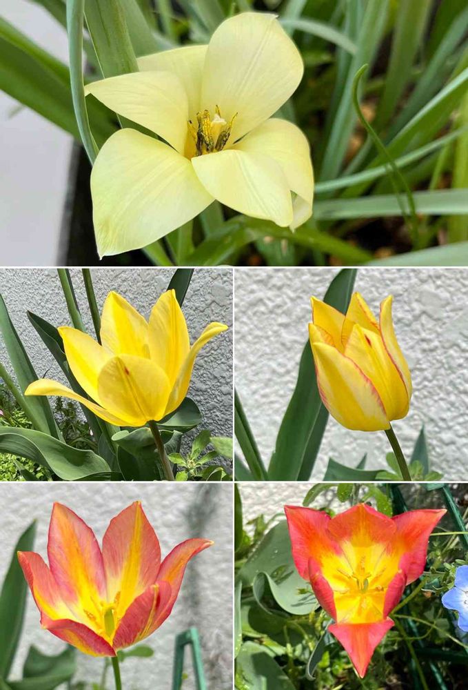 上の淡い色の原種系チューリップは植えっぱなしの鉢からひとつ咲いてくれました