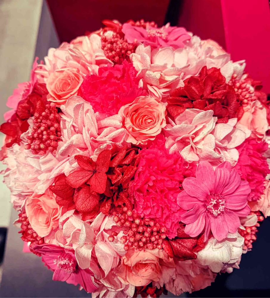 赤・ピンク系だけって意外とありそうでないアレンジですよね💕(ふつうはもっと白とか入ってそう)