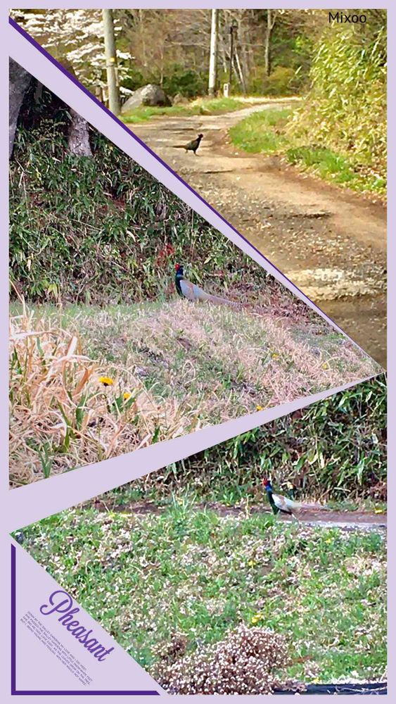 出早公園でカタクリを撮った後、近くの山道を歩いていると、雉がデカイ声で鳴くではありませんか⁈ 追いかけて撮ろうとすると、走って逃げます。スマホではこの解像度が限界か⁈ やむなく、コラージュにいたしました。