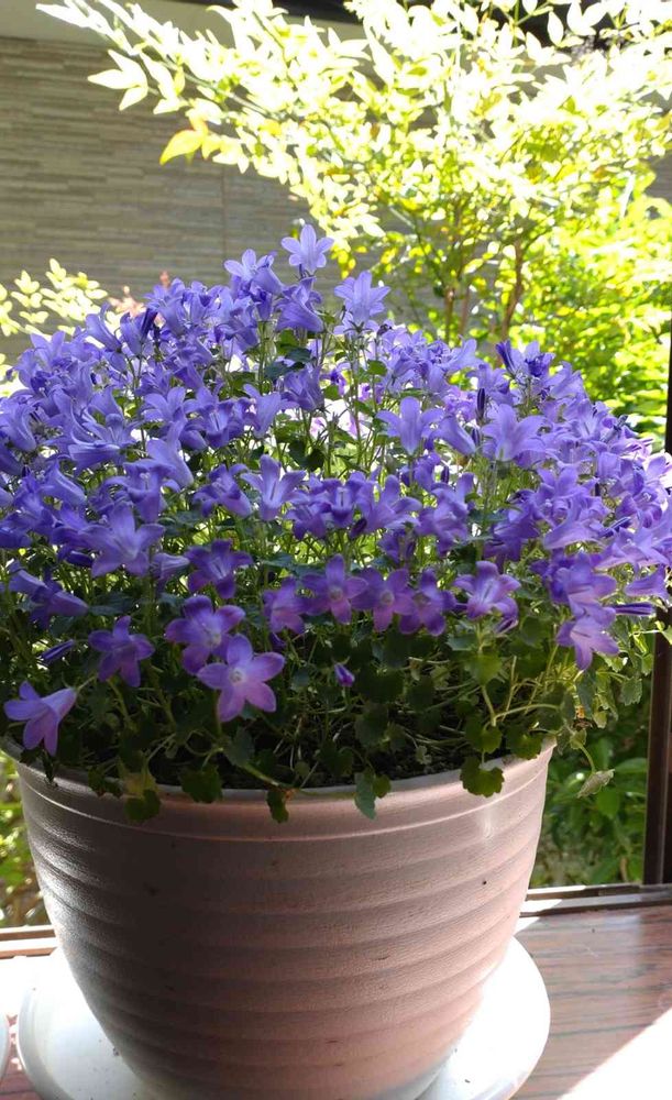 出窓の7号鉢にサイズ🆙した4年目のベルフラワー(オトメキキョウ)さんです😋…