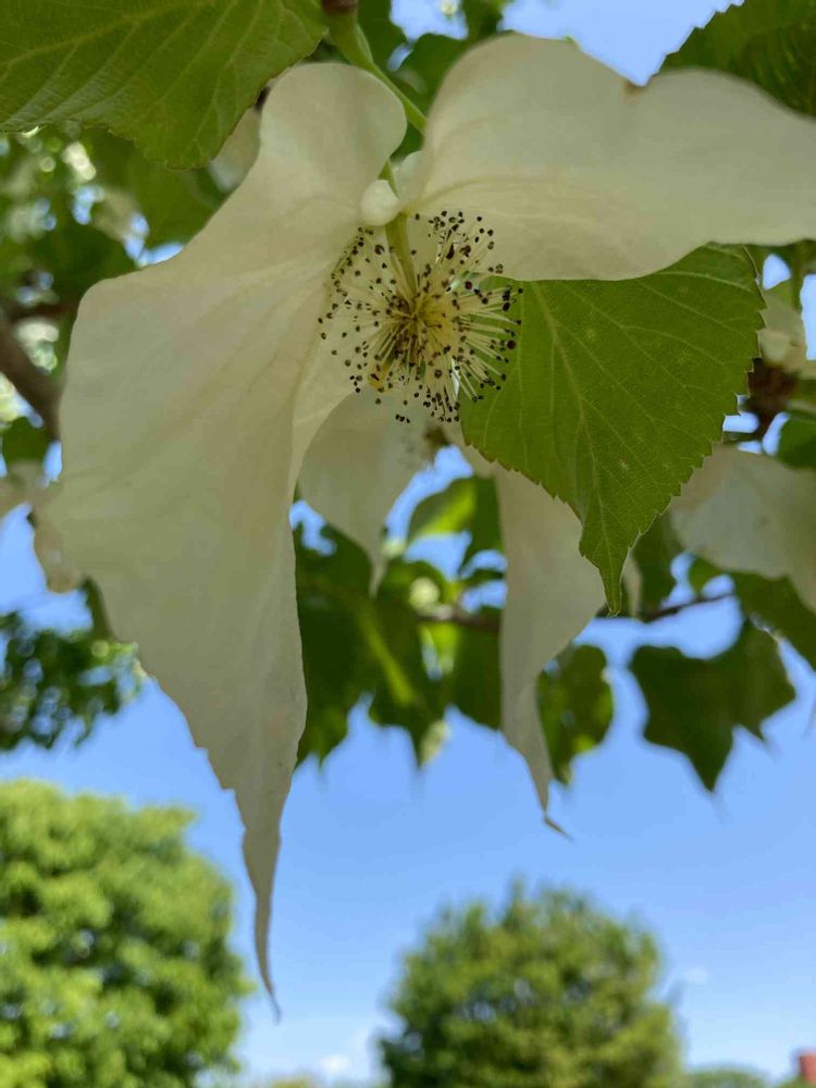 中国原産の落葉樹で 球形の花を覆うように🍃葉が変化した苞と呼ばれる🤍白い部分が垂れ下がっていて 純白のハンカチのように見える
