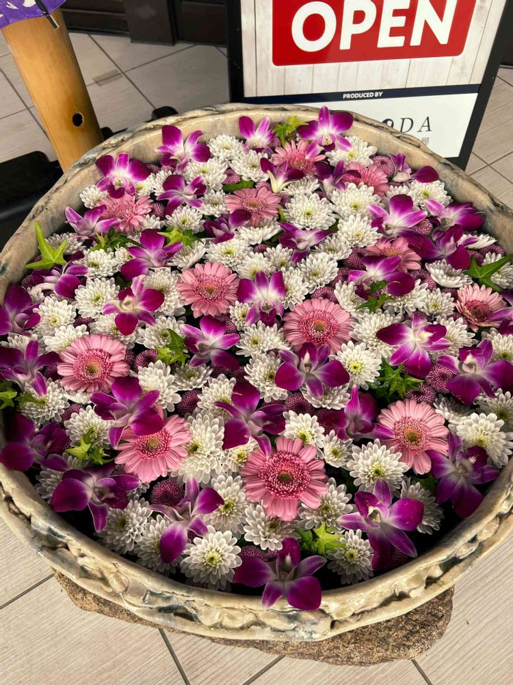 行田市「観光物産館ぶらっと♪ぎょうだ」の花手水(はなちょうず)。