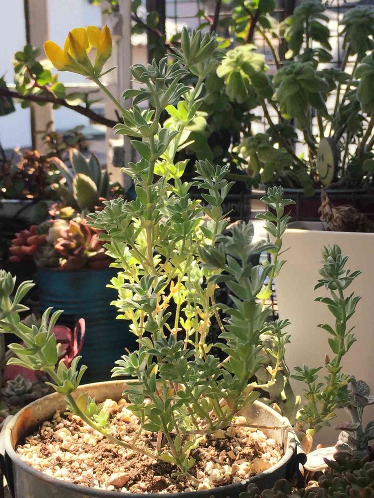 名前忘れたけど豆科の観葉植物に黄色いお花が咲きました🌼
