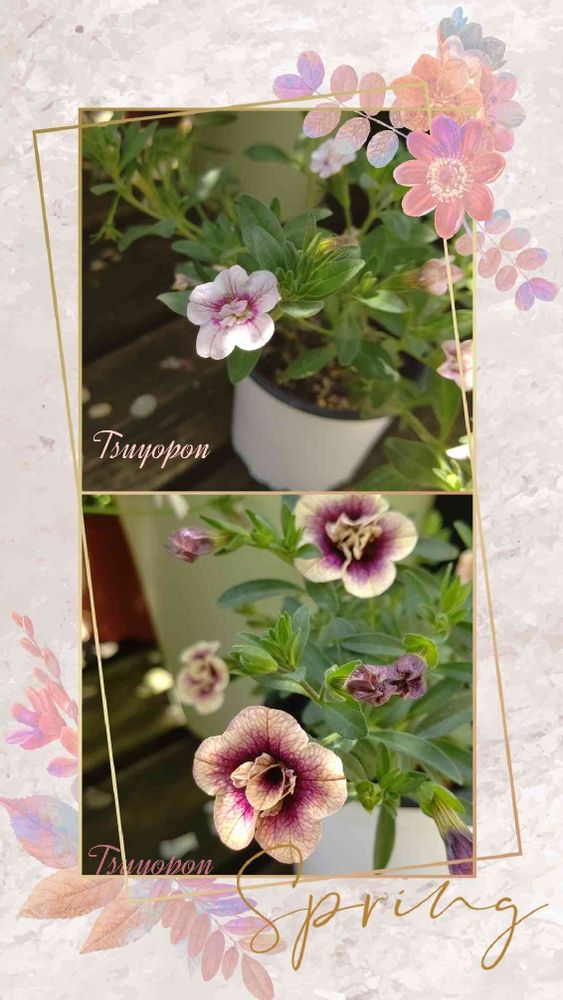 挿し木っ子カリブラコアのいちごみるくさん⬆️とラムレーズンさん⬇️、無事に冬を越してお花が咲き始めました~(⁎˃ᴗ˂⁎)ワーイ♪