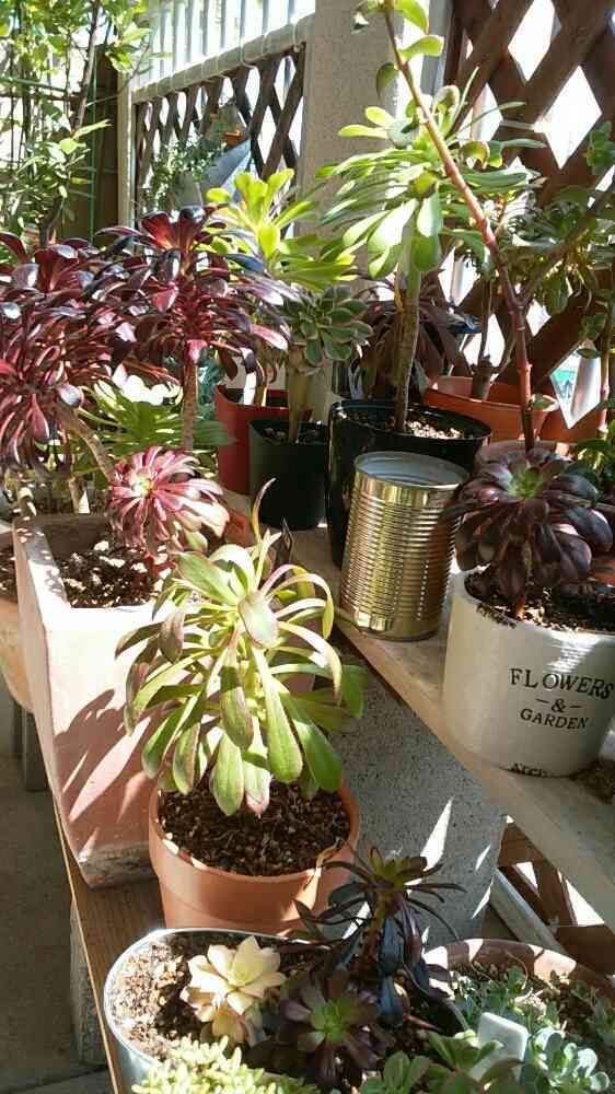 こんにちは。我が家の狭いベランダのアエオニウムのコーナーです。黒法師が