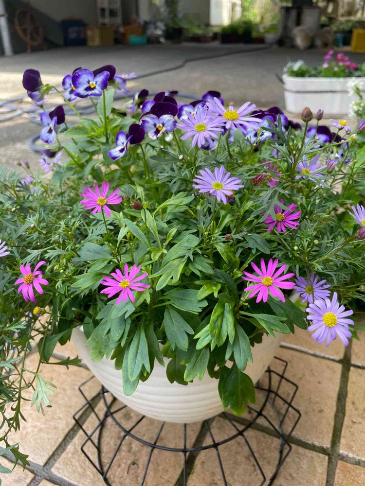 今日投稿したすぐ楽星空マムバニラ&ソーダとビオラの寄せ植えの反対側。姫小菊も咲いてました。すぐ楽星空マムバニラ&ソーダと姫小菊は去年も寄せ植えしていたコンビ、冬越しした子達です🥰