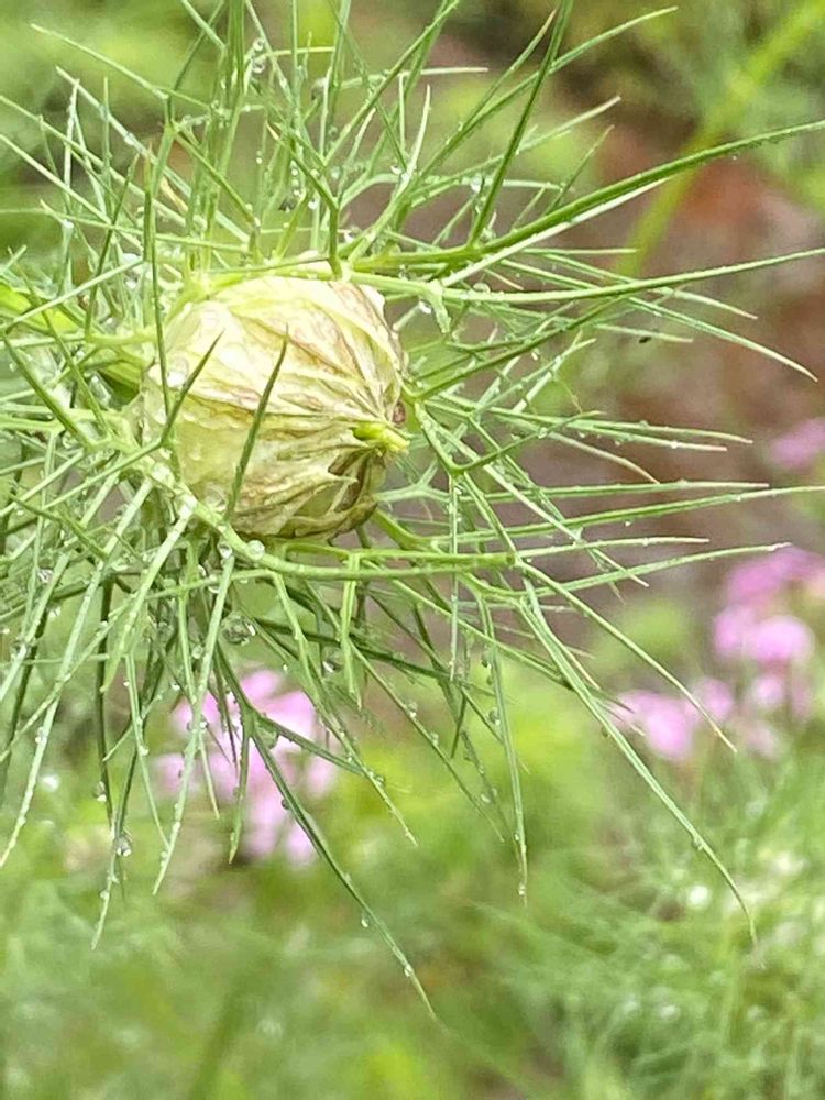 今日のお花「ニゲラ」の今日の様子☔️ちょっと近づいて観察してきました。もうちょいで咲きそうなツボミがたくさん✨後ろのぼんやりピンクはローズゼラニウムのお花です😊
