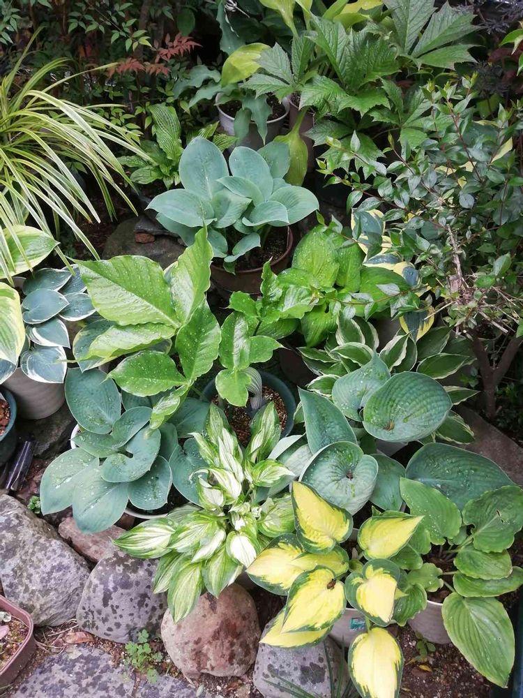 玄関脇に鉢植えのギボウシ、ムサシアブミ、ヤグルマソウなどを配置。ちょっとシェードガーデンの雰囲気出てます?