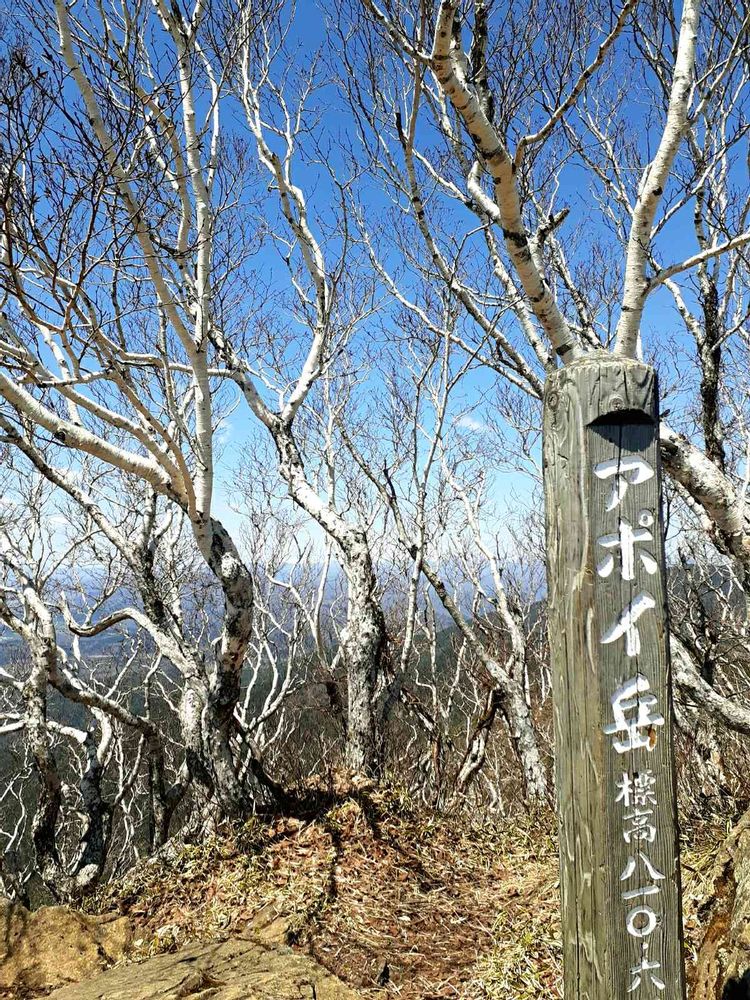 ダケカンバの林におおわれたアポイ岳の山頂です。登る途中から南には太平洋の海、北には雪残る日高山脈、遠くに襟裳岬が見えていました。5合目から森林限界となり、ゴツゴツとしたかんらん岩の露地にハイマツ帯が広がります。厳しい環境の中で生き抜く頂上のダケカンバの姿に感動しました。〈2022.4.30〉