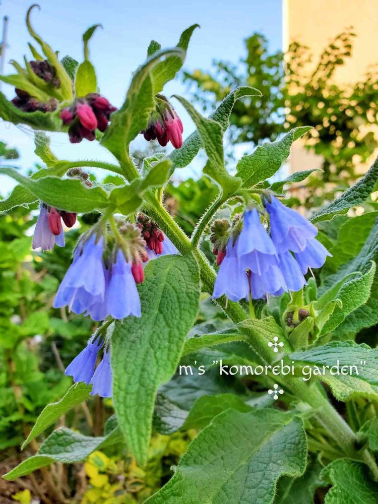 優しいブルーで可愛らしい花が咲くのね。赤い色はこれから咲く花ですか。ブルーになるのかな。