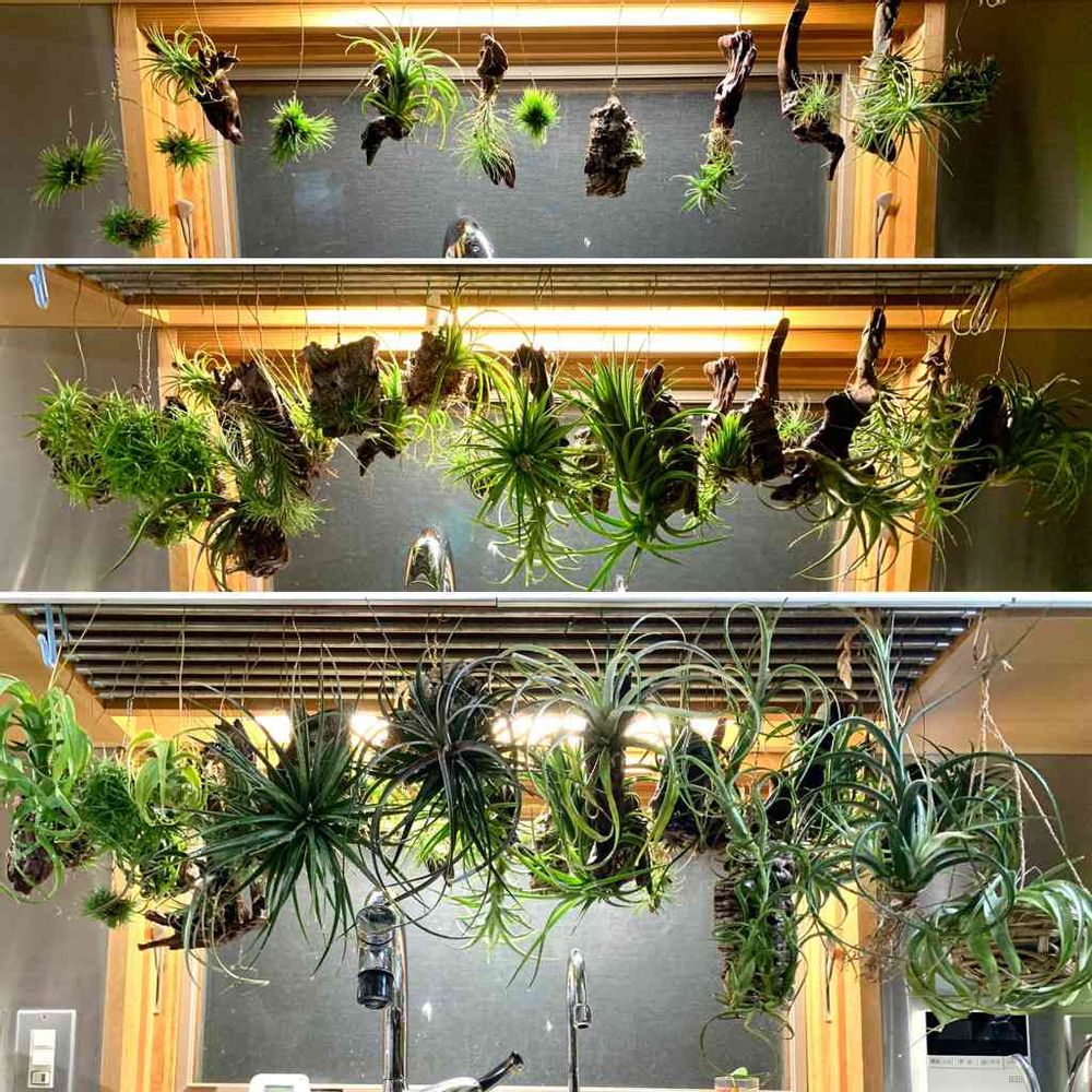 どんな風に吊るされているのかしら?例えばプランツ達に元々ワイヤーなどを巻き付けてあり端を引っ掛けているとか…🤔
