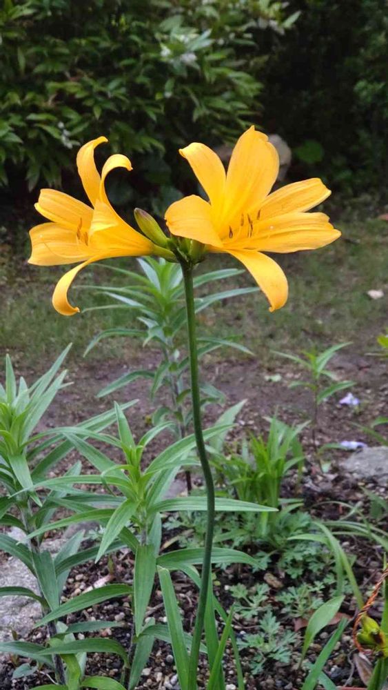 色鮮やかなオレンジに近い黄色のこの花は ヒメカンゾウ(姫萱草)です。